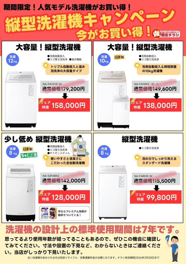 そんなタイミングでぴったりなキャンペーンのご案内です!パナソニックの人気モデル洗濯機が期間限定のフェア特価で登場!ドラム式も縦型も、今がお買い得ですよ😊
